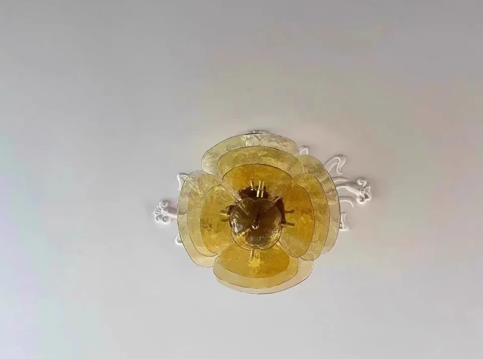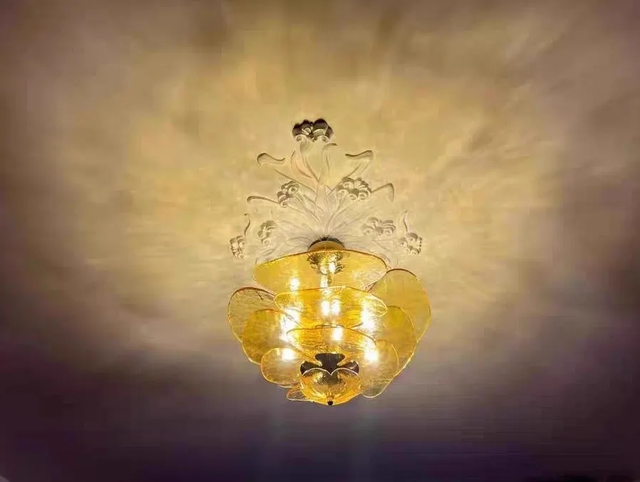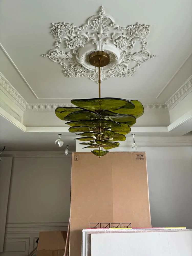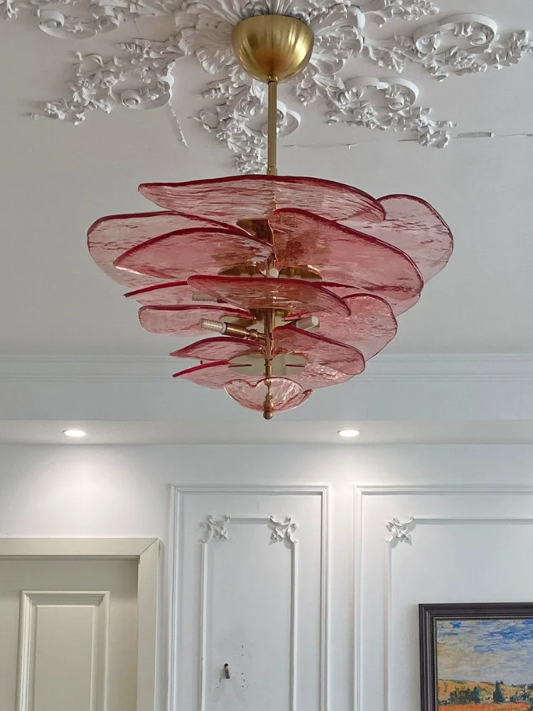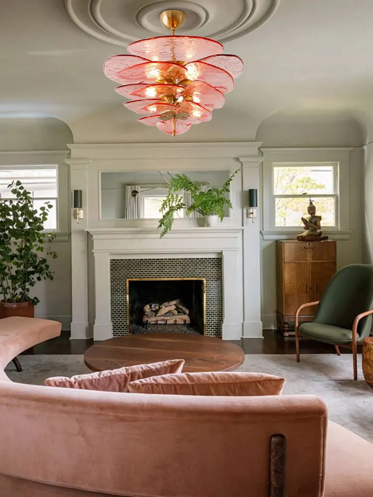 The Aurora PetalWave Art Glass Chandelier captivates with its sculptural Art Deco silhouette and cascading handcrafted glass petals. Each glass plate—available in pink, clear, green, or amber—creates a shimmering, organic flow that transforms your living space into a gallery of light. Supported by a polished metal frame, this chandelier blends fine artistry with modern LED performance, making it a standout centerpiece for luxurious living rooms, dining rooms, and high-end interiors. Perfect for homeowners seeking a refined, elegant, and visually mesmerizing lighting fixture.