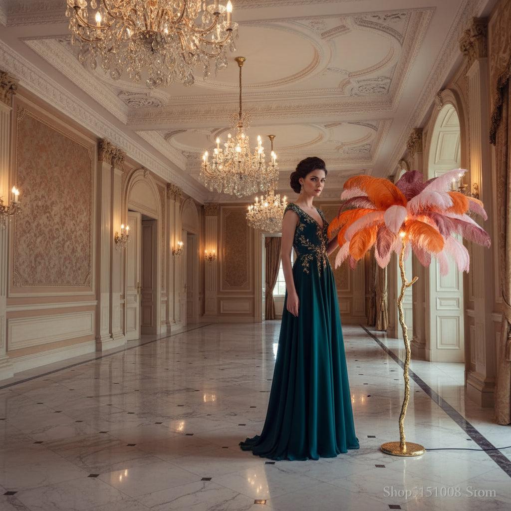 An illuminating sculpture of opulence, the Ostrich Feather Brass Table Lamp evokes timeless elegance and Hollywood glamour. Each lamp features a polished brass palm structure crowned with a canopy of soft, hand-dyed ostrich feathers that diffuse light with irresistible warmth and texture.