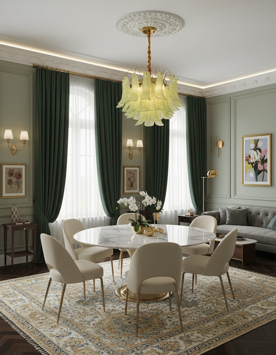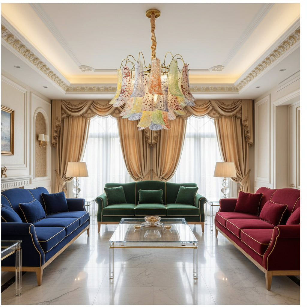 Elevate your interior with this luxury Venini-style glass chandelier, a perfect blend of Italian artistry and modern elegance. Handcrafted with a gold-finished metal frame and adorned with colorful glass lampshades in vibrant tones of green, blue, yellow, red, and orange, this chandelier adds a radiant focal point to any space. Designed for versatility, it supports E12/E14 bulbs and is compatible with dimmers, allowing you to create the perfect ambiance. Certified for international standards, it’s an ideal statement piece for luxury living and dining spaces.