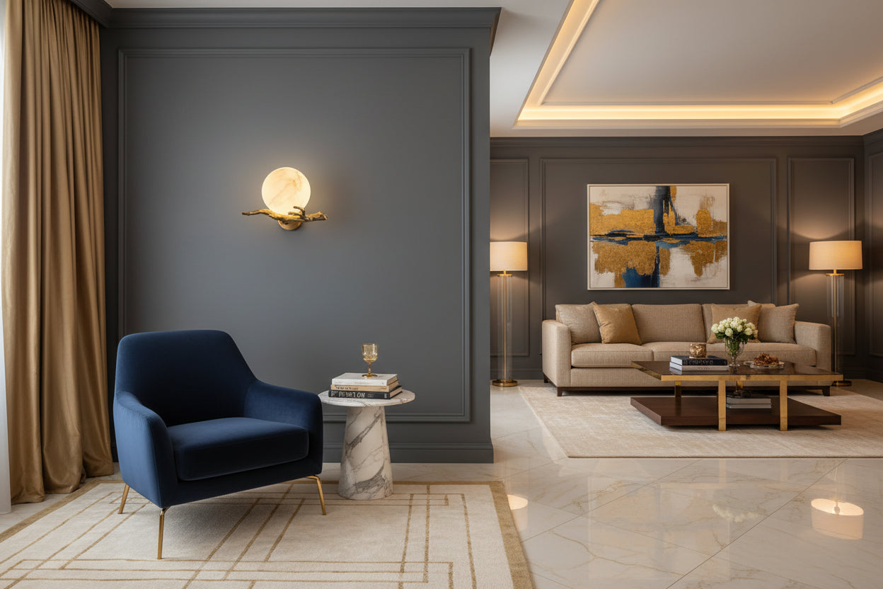 Blending sculptural elegance with natural beauty, the Alba Branch Alabaster Wall Sconce showcases exquisite craftsmanship and refined artistic design. Featuring a handcrafted brass branch structure with a luxurious brass finish, this wall light supports a glowing alabaster globe that creates a soft, warm ambiance perfect for sophisticated interiors.