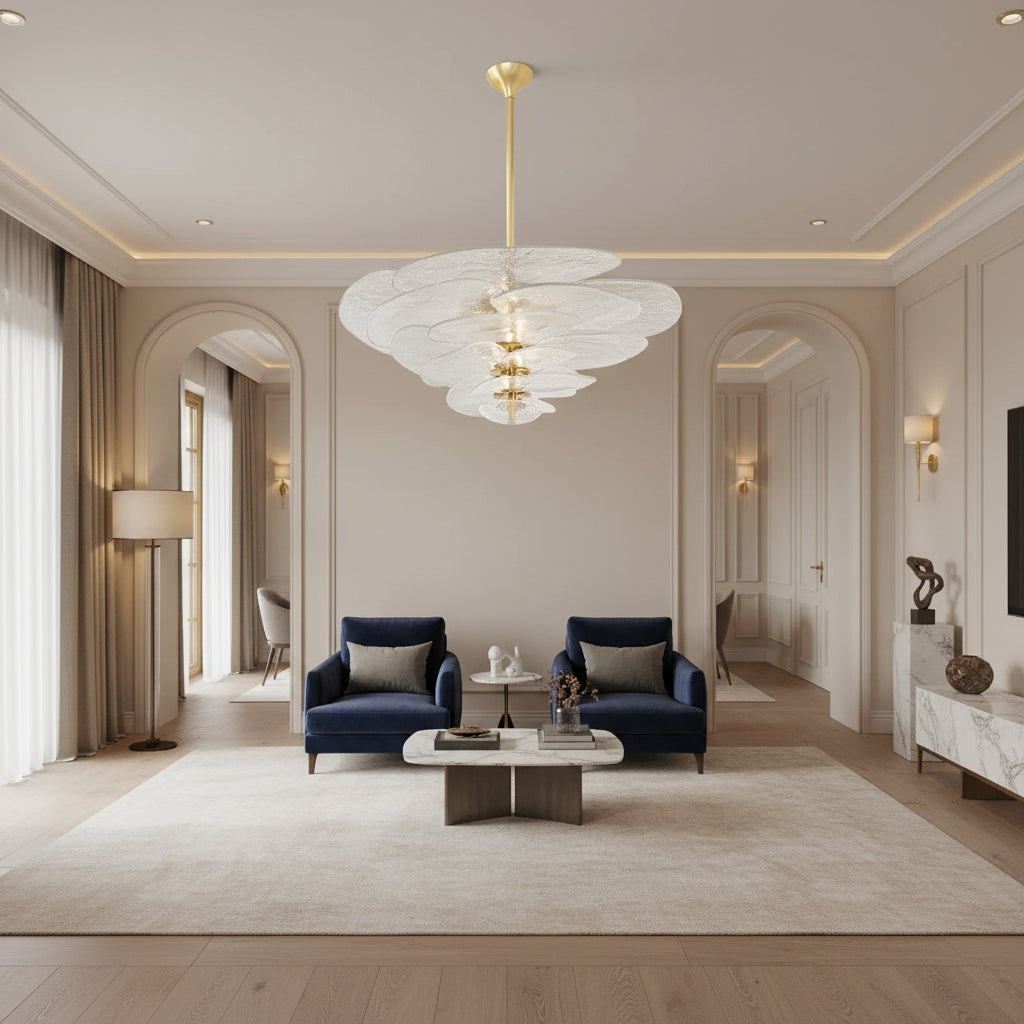 The Aurora PetalWave Art Glass Chandelier captivates with its sculptural Art Deco silhouette and cascading handcrafted glass petals. Each glass plate—available in pink, clear, green, or amber—creates a shimmering, organic flow that transforms your living space into a gallery of light. Supported by a polished metal frame, this chandelier blends fine artistry with modern LED performance, making it a standout centerpiece for luxurious living rooms, dining rooms, and high-end interiors. Perfect for homeowners seeking a refined, elegant, and visually mesmerizing lighting fixture.