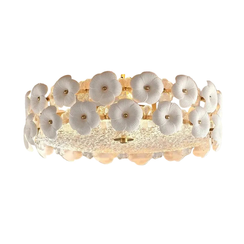 This stunning ceiling light artfully blends ceramic, glass, and brass to create a sophisticated centerpiece for modern interiors. Delicately sculpted ceramic flowers encircle the light source, diffusing illumination into a soft, warm glow that enhances the atmosphere of any room.